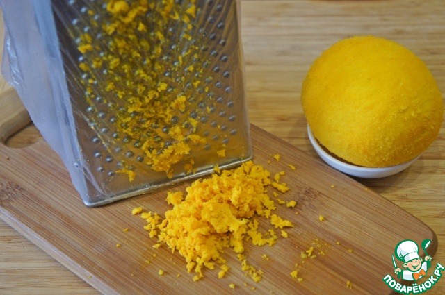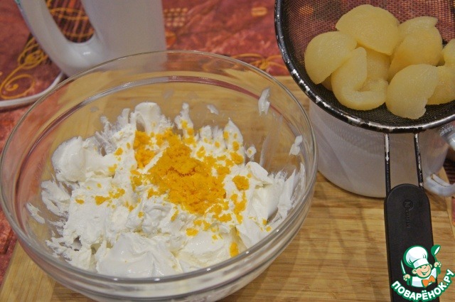 С апельсина стереть цедру. Фрукты (у меня груши в сиропе) откинуть на дуршлаг.