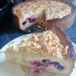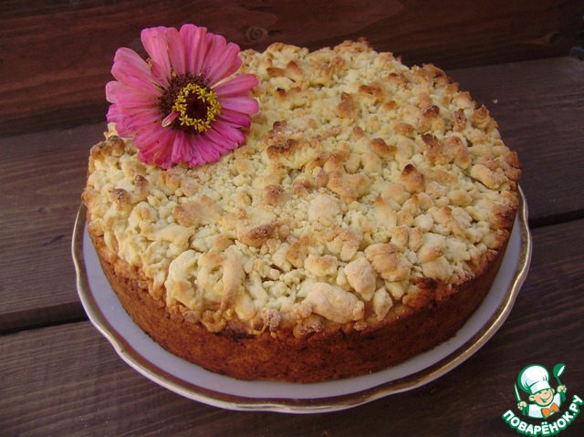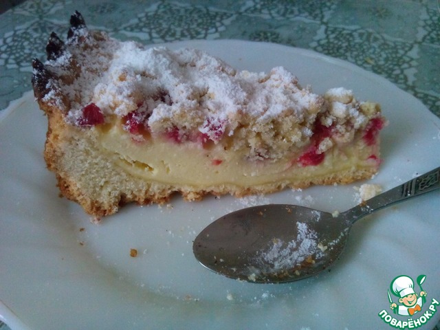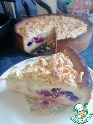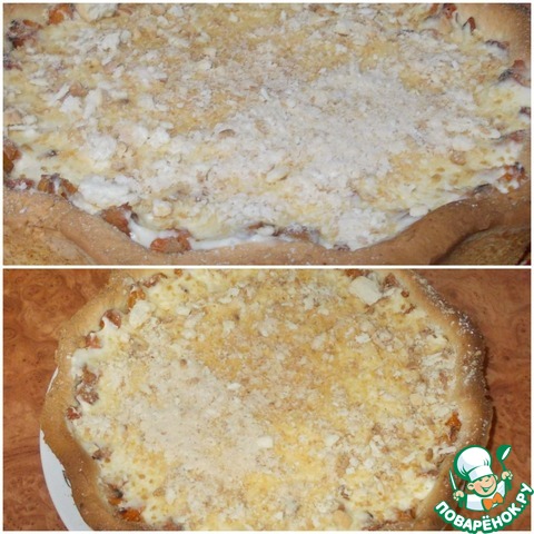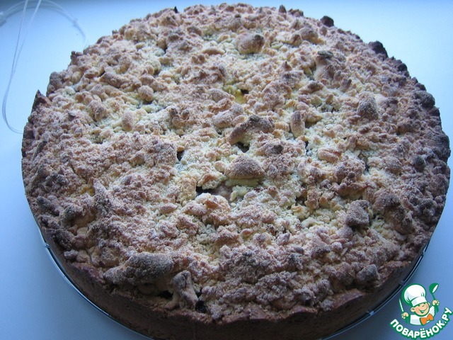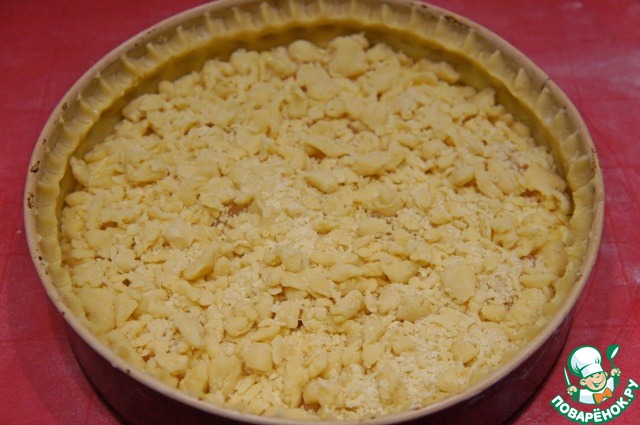 2. "В оставшееся тесто добавить 2 ст. л. муки и перетереть до получения довольно крупной крошки, так они получаются более нежными. Равномерно распределить крошку на начинке."