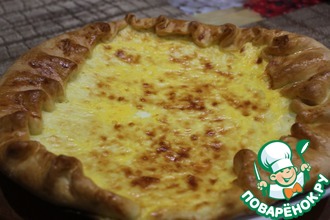 Поставить пирог выпекаться в заранее разогретой до 200*С духовке на средней полке 40-50 минут до золотистого цвета. За 10 минут до готовности проткнуть начинку в нескольких местах деревянной лучинкой, это предотвратит её оседание. По готовности пирога духовку выключить и оставить в ней пирог еще на 10 минут. Готовый пирог извлечь из духовки, дать ему остыть в форме.