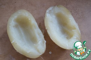 Готовый картофель развернуть из фольги, разрезать пополам и вынуть мякоть чайной ложечкой