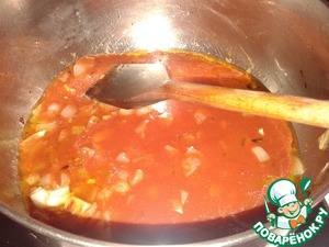 После этого добавляем томатный сок, воду, соль, сахар, перец.