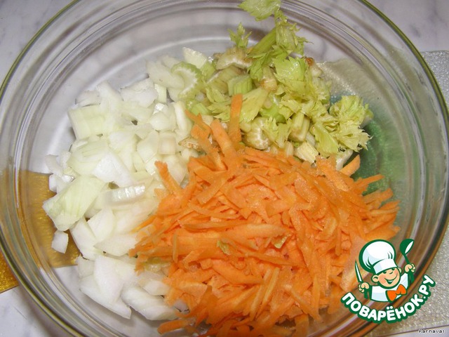 Порезать лук, морковь, сельдерей и потушить на небольшом количестве сливочного масла.