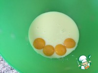 Добавляем к нему четыре желтка. Очень важно качественно отделить желтки от белка. Белок нам понадобится для третьего слоя - а пока, его убираем в холодильник.