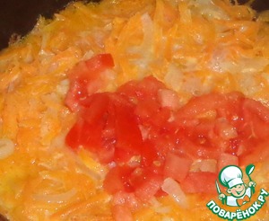 Помидор порезать кубиками и добавить в сковороду.