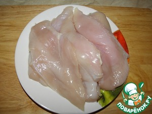 Я вырезала красивые кусочки, а точнее, серединки из еще замороженного филе (так легче нарезать тонкие кусочки, тогда их и отбивать необязательно), а из краёв приготовила Филе куриное с луком и фасолью (в Поваренке есть рецепт).