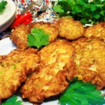 Подготовить кляр: Сырой картофель натереть на терке, добавить мелко нарезанный лук, измельченный чеснок, яйца, мелко нарезанную зелень, муку, майонез со сметаной, посолить, поперчить, добавить (если хотите) специи. И хорошо перемешать