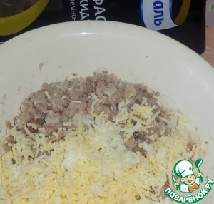 Отварное яйцо потереть на мелкой терке и добавить к рыбному филе и фасоли.