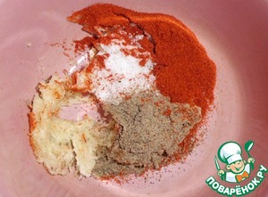Чеснок натереть на мелкой терке. Добавить соль, черный молотый перец, паприку сладкую, перемешать.