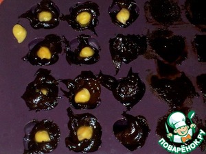 Одна девочка раскладывала в ячейки силиконовой формы шоколад маленькой ложечкой. Другая вдавливала в шоколад сахарный нут в форму - сердечки, затем коньячный нут в розочки и бантики. Верх запачкался. Я налила растительное масло в маленькую креманку. Обмакнув указательный пальчик старшая девочка сверху его поправила. Ячейки заполнены. Обтерев форму от масла и шоколада убрала её в морозильную камеру на 25 минут.