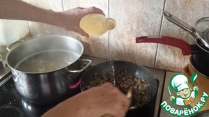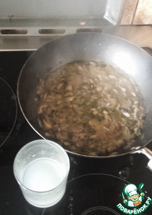 5. Добавить грибы, протушить немного, залить белым вином, оставить тушиться, пока вино не испарится