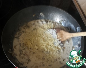 7. Протушить, желательно помешивая, 5-7 минут. Добавить сливки и немного тертого сыра, хорошо перемешать.