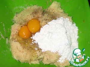 Добавить яйца, муку, соль и перец. И хорошенько всё перемешать.