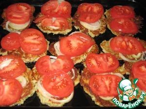 Затем на лук выкладываем тоненькие кружочки помидоров. Можно немного посолить.