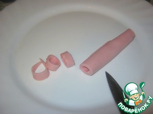 Отдельно, два оставшихся ломтика колбасы свернуть в две трубочки