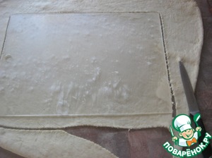Раскатываем тесто в прямоугольник (или стараемся в подобное), я уме только по шаблону))-идеально для меня разделочная доска-она прямоугольная
