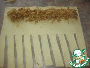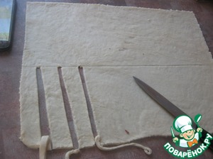 Делим приблизительно тесто на две части-верхняя немного меньше нижней и делаем разрезы в нижней части, как показано на фото (делаем не только разрезы, а и расстояние между ними)