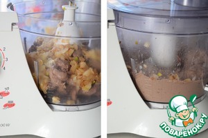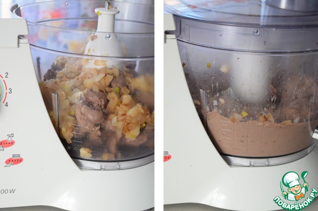 В чашу комбайна (блендера) сложить отваренную печень, обжаренный лук и измельчить.