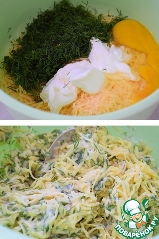 Добавляем яйца, порезанную зелень, сметану и хорошо перемешиваем.
