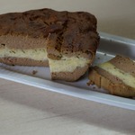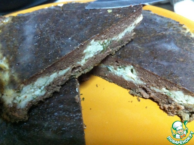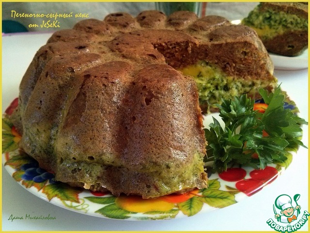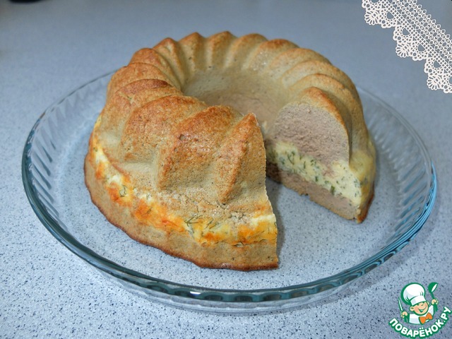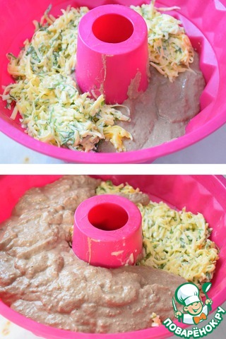 В смазанную растительным маслом форму для кекса (силиконовую тоже обязательно смазываем) выкладываем 1/2 часть печеночной массы, затем весь сыр и сверху выкладываем вторую часть печеночной массы.