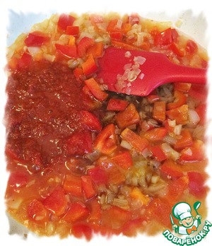 В той же сковороде где жарился баклажан обжарить лук до прозрачности, добавить чеснок и перец и обжарить всё вместе ещё минуты 3-4.