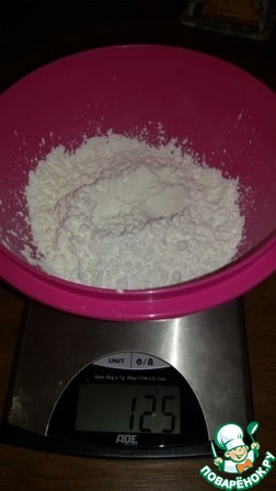 Отмеряем муку и крахмал (можно и картофельный, и кукурузный - это не принципиально) и всыпаем разрыхлитель. Перемешиваем и добавляем к остальным продуктам.