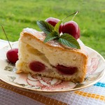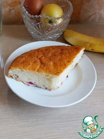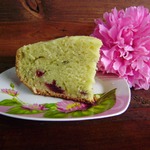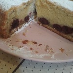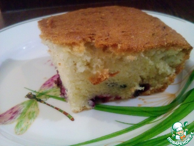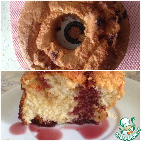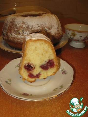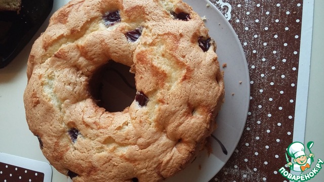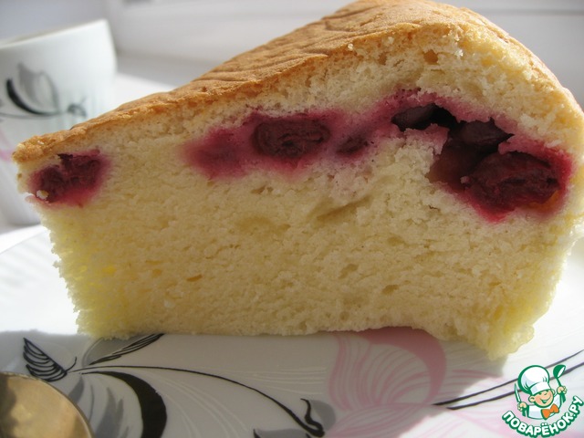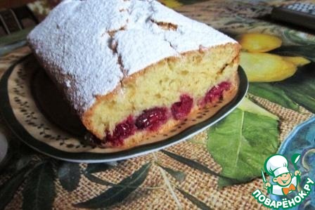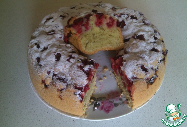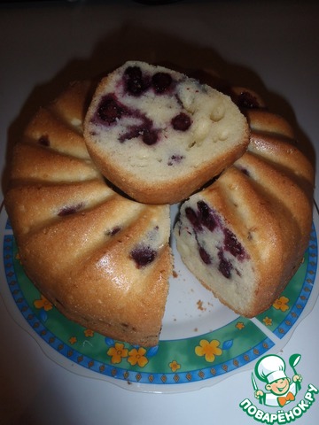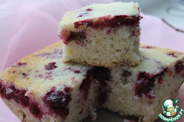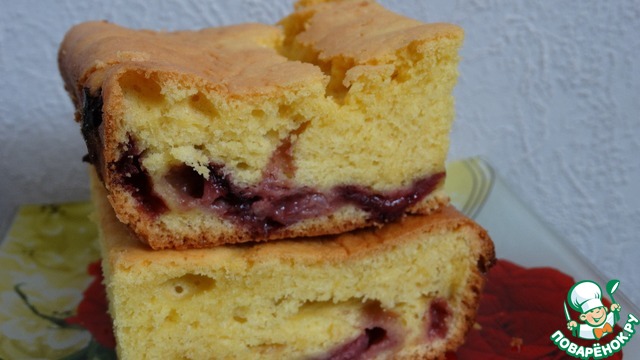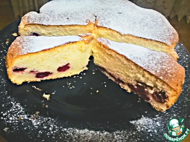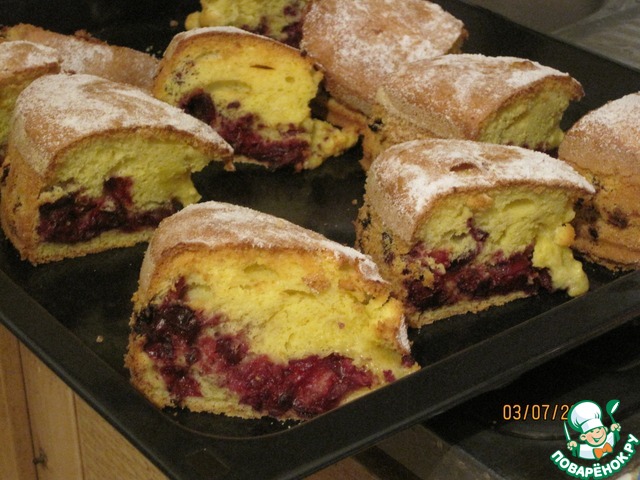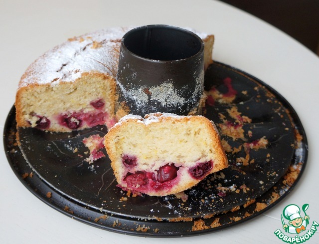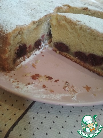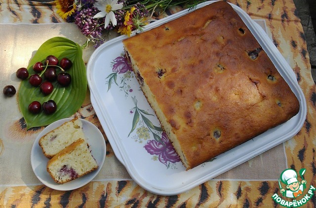 В форму, смазанную маслом и посыпанную мукой, выложить половину теста, сверху выложить вишню.