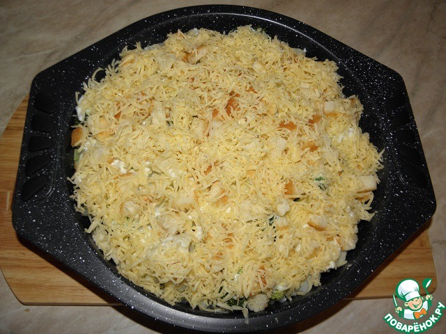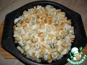 Далее, на капусту распределяем равномерно соус, на соус выкладываем сухарики.