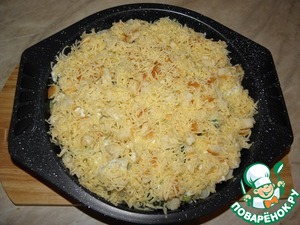 Все посыпаем сыром ( у меня мелкая терка) Разогреваем духовку 180 градусов, и ставим запеканку минут на 35-40 ( смотреть по готовности, не пересушить)