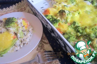 Форму смазать чуть маслом, выложить нижний слой из рыбы, (проверить на специи) сверху на нее распределить капусту ( капусту можно оставить крупней, а можно еще на средние соцветия разобрать)