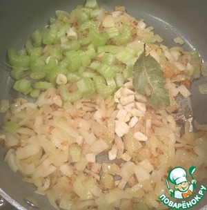 Нарежьте лук, сельдерей и чеснокипассируйте на сковороде. По желанию ( я испытываю нежные чувства к лавровому листу), добавьте в сковороду.