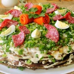 Верхушку и бока торта смазываем майонезом. Посыпаем мелкорубленым луком. Выкладываем на верхушку торта перепелиные яйца, розочки из отварной морковки и кусочки сырокопченой колбасы.