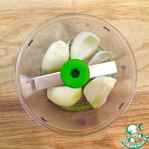 Мелко режем лук. У меня для этого есть вот такое чудо-приспособление! Потом заливаем его уксусом и таким же количеством кипятка. Оставляем минут на 5, чтобы промариновался.