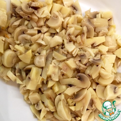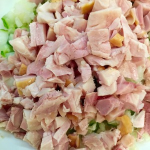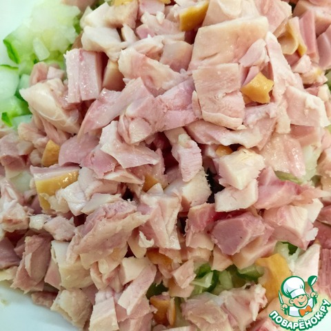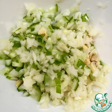 Так же поступаем с огурцом. Лук процеживаем и добавляем туда же.