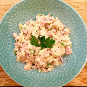 Простите, более оригинального названия не придумала) Захотелось мне салат с копченой курицей, вот именно такого и всё тут! Просмотрела кучу рецептов, но лично мне всё не то! И решила я поэкспериментировать. Салатик получился очень вкусный и пикантный. В общем представляю на Ваш суд мой полет фантазии. Надеюсь, Вам понравится моя импровизация, ибо я ее уплетала за обе щеки!!