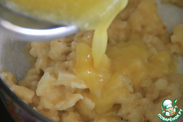 Банан растолочь вилкой, залить маслом и молоком. Добавить эссенцию, яйцо и струшку. Тщательно перемешать, затем аккуратно ввести эту массу в сухую мучную и перемешать (важно не ПЕРЕмешать и не повредить консистенцию.)