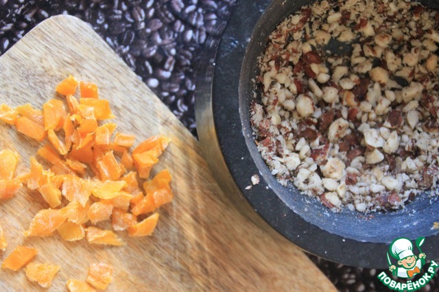 Размягченное масло смешать с сахаром и мукой. Соединить с орехами и манго