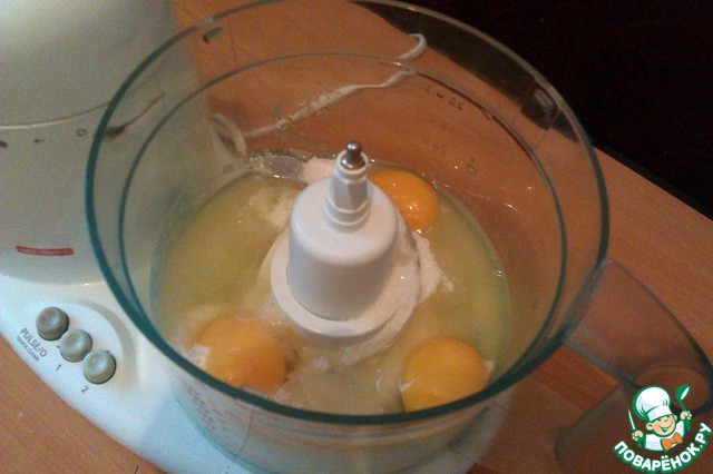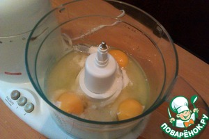 В чашу блендера насыпаем сахар и яйца, взбиваем.