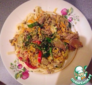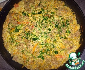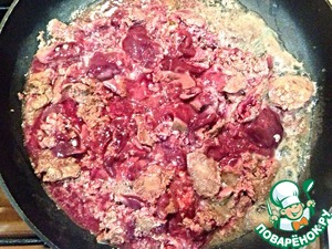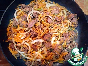 Добавим овощи к печени, и добавим еще воды, соль, специи, тушим все минут 10.
