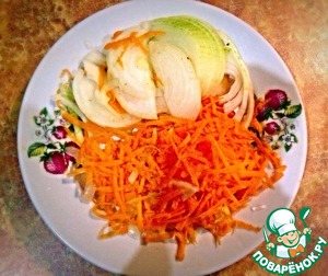 В это время нарежем полукольцами лук, натрем на крупной терке морковь.