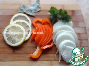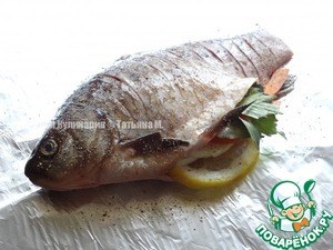 Взять лист фольги, смазать маслом, уложить на масло карася, вложить внутрь дольку лимона, 2-3 кольца лука, немного перца болгарского, лавр, пару листиков любистока.