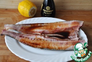 Разрезаем тушку рыбы вдоль хребта, поливаем соком лимона и соевым соусом ТМ Kikkoman. Отставляем мариноваться.