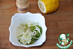 Смешиваем лук, чеснок и укроп, поливаем соком лимона и посыпаем молотым чёрным перцем.