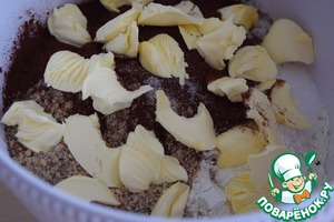 Муку, орехи, сахар, ванильный сахар, соль, какао и сливочное масло ( маргарин) в виде хлопьев, помещаем в большую ёмкость ( миску ).