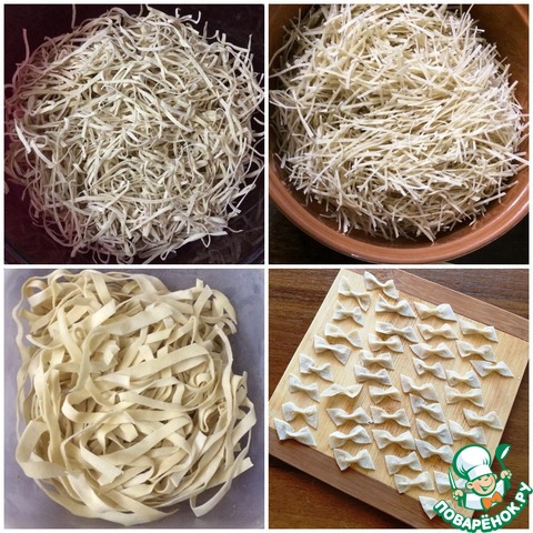 -Нарезать полоски на прямоугольники, затем середину каждого прямоугольника просто сжимаем пальцами, так и получается паста Фарфалли.