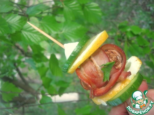Очень красивая и вкусная закуска. Делается быстро, гости всегда в восторге. Подавать прямо на шампурах - так эффектнее.