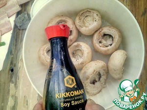 Моем шампиньоны, высушиваем бумажным полотенцем, вырезаем ножку, хорошо сбрызгиваем соевым соусом ТМ "Kikkoman". Оставляем на 30 минут