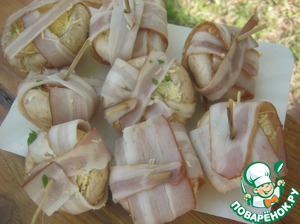 Заворачиваем начиненные шляпки в длинные (тонко нарезать попросила в магазине) полоски бекона. скрепляем зубочистками