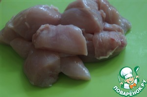 Куриное филе промыть, обсушить бумажным полотенцем и нарезать крупными кусочками размером примерно 3*4 см с толщиной 1 см.