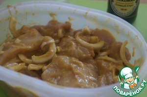 Вылить маринад в герметично закрывающийся контейнер, добавить нарезанный полукольцами репчатый лук и куриное филе. Все перемешать и закрыть крышкой. Убрать в холодильник на ночь или на 4-6 часов.