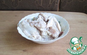 Режем курочку на кусочки, посыпаем специями, добавляем чеснок, майонез по вкусу. Я добавляю пару ложек на пол курицы. Не люблю много. Оставляем мариноваться.
